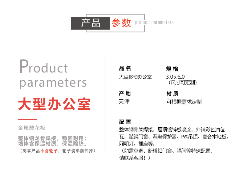 配置:整體鋼骨架焊接,屋頂鍍鋅板噴涂,外鋪彩色油氈瓦,塑鋼門窗、漏電保護(hù)器、PVC吊頂、復(fù)合木地板、照明燈、插座等。(如需空調(diào)、斷橋鋁門窗、隔間等特殊配置請(qǐng)聯(lián)系客服!)